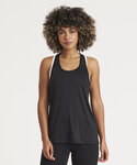 Girlie fit vest with mesh panel and racerback styling. Featuring high performance wicking fabric and dropped hem at back.