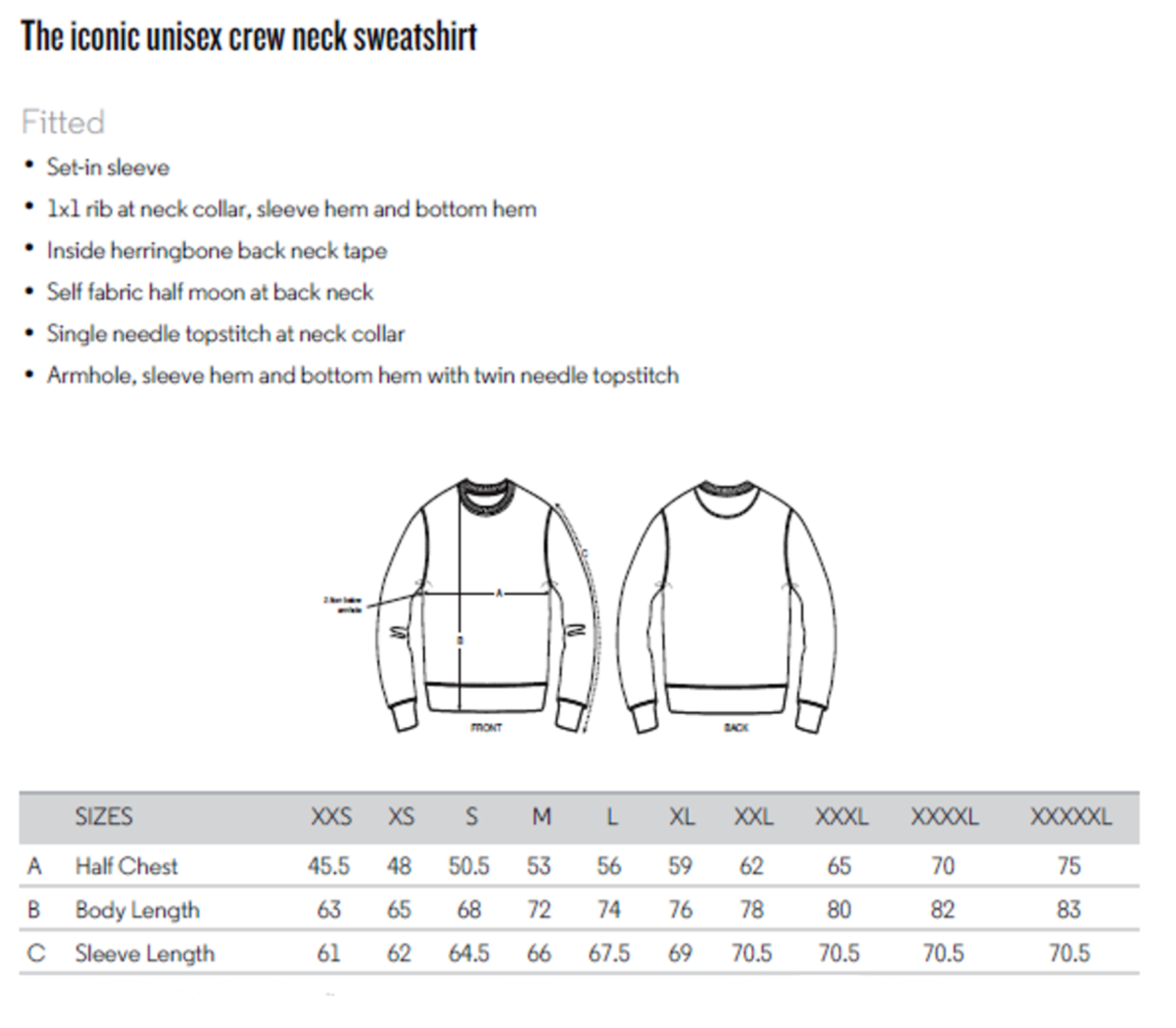 Set-in sleeve. 1x1 rib at neck collar, sleeve hem and bottom hem. Inside herringbone back neck tape. Self-fabric half-moon at back neck. Single-needle topstitch at neck collar. Armhole, sleeve hem and bottom hem with twin-needle topstitch. Unisex, medium fit, long sleeve, round-neck.