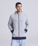 Long sleeve regenerated cotton zoodie with brushed inner and peached outer face. Features include set-in sleeves, contrast rib at cuffs hem, full length front zip and kangaroo pocket.